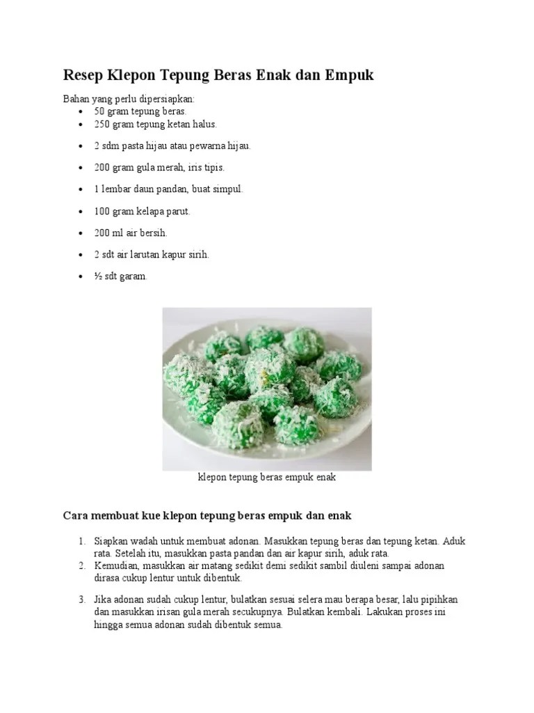 Campurkan dan aduk 1/4 sdt garam, air kapur sirih, air daun suji dan tepung beras. Campur tepung beras, tepung ketan, garam dan air pandan hingga adonan bisa dibentuk. 26.01.2019 · 300 gr tepung beras; Uleni adonan sampai menjadi kalis dan tidak terasa lengket di tangan. 2.544 resep klepon tepung beras ala rumahan yang mudah dan enak dari komunitas memasak. Lihat juga resep kue klepon tepung beras enak. 04.10.2021 · tepung ketan 50gr tepung beras 200ml air hangat/air pandan • gula merah, sisir • kelapa parut, kukus selama 10 menit ๐๐๐ข ๐๐๐๐๐ ๐๐๐๐๐๐ klepon Tepung beras ketan 250 g. 1 sdt air kapur sirih; Air secukupnya untuk mempermudah membentuk. Sebelumnya tepung sudah harus anda ayak dulu agar lebih halus. Cara membuat nagasari tepung beras : Namun, hasilnya tak selalu seperti yang diharapkan.